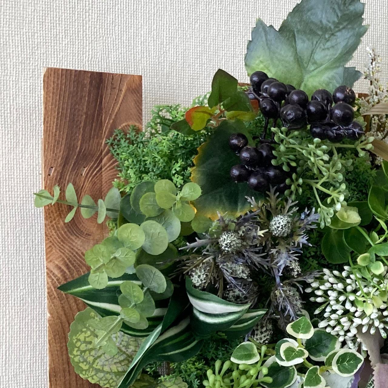 - 特徴:たくさんの葉や木の実などまるで植物に囲まれているような印象が漂う癒やしの空間を演出します。裏面がネットになっているので壁面などにもフックなどを使って簡単に設置できます。(重量に対応しフックが取付けられる壁に限ります)