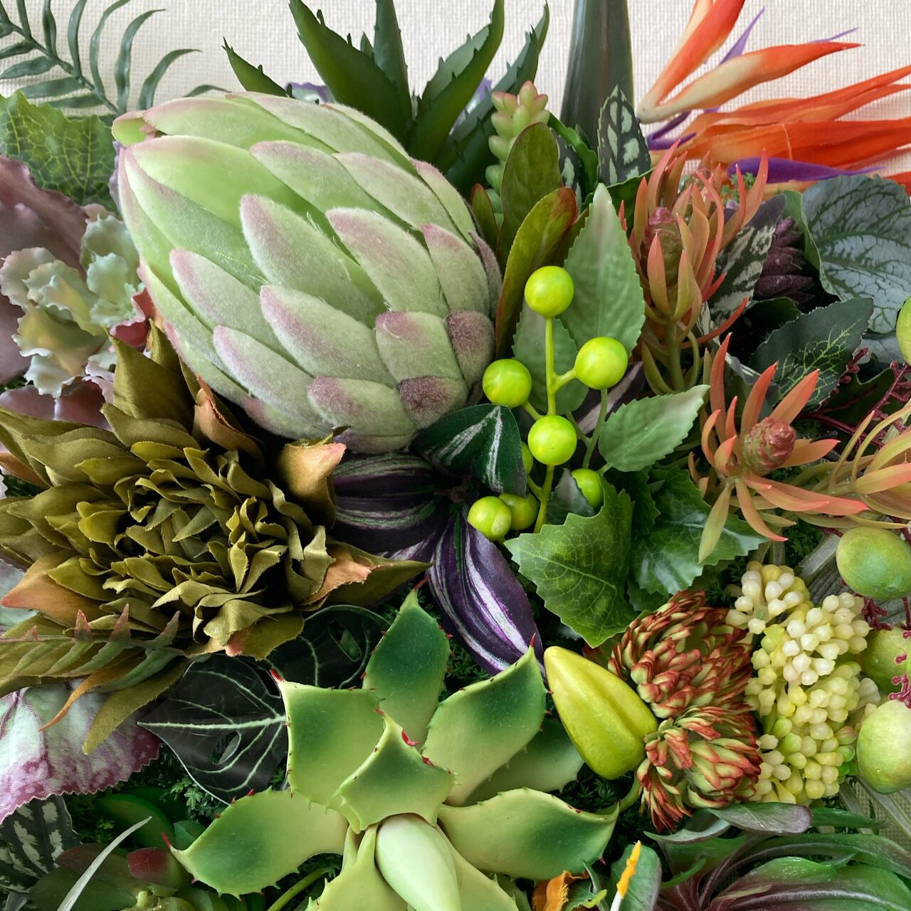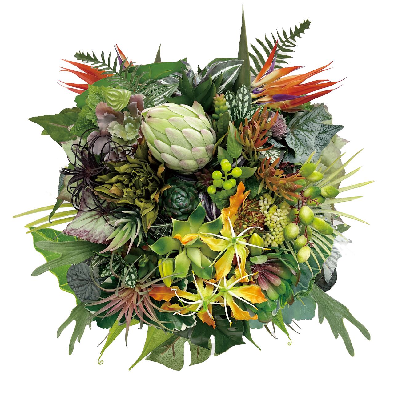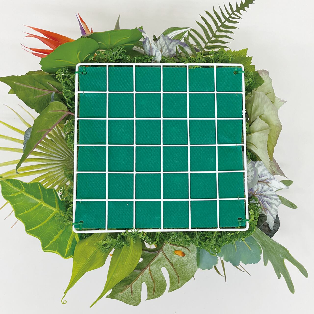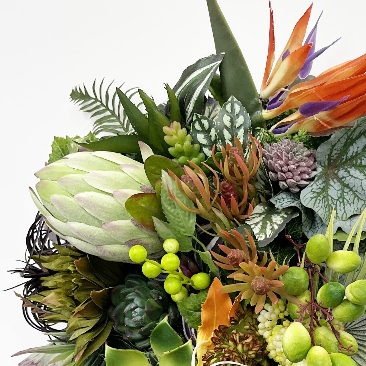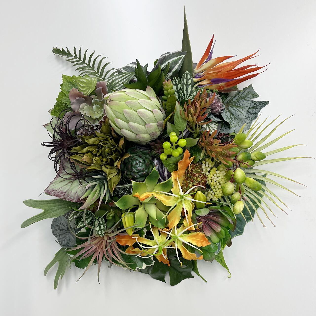 - 特徴:鮮やかな色彩の植物がエキゾチックな中にも開放的な印象を与え癒やしの空間を演出します。裏面がネットになっているので壁面などにもフックなどを使って簡単に設置できます。(重量に対応しフックが取付けられる壁に限ります)
