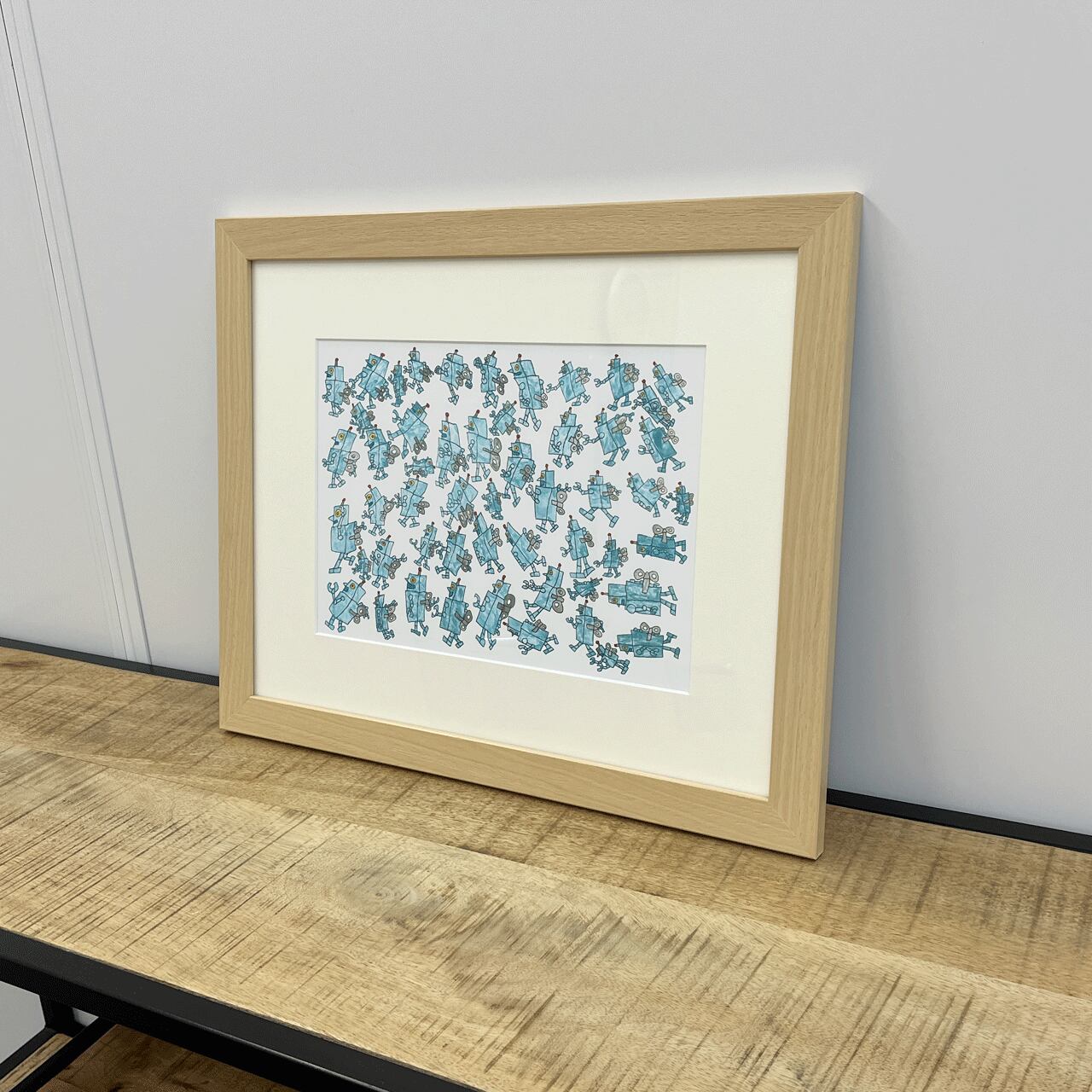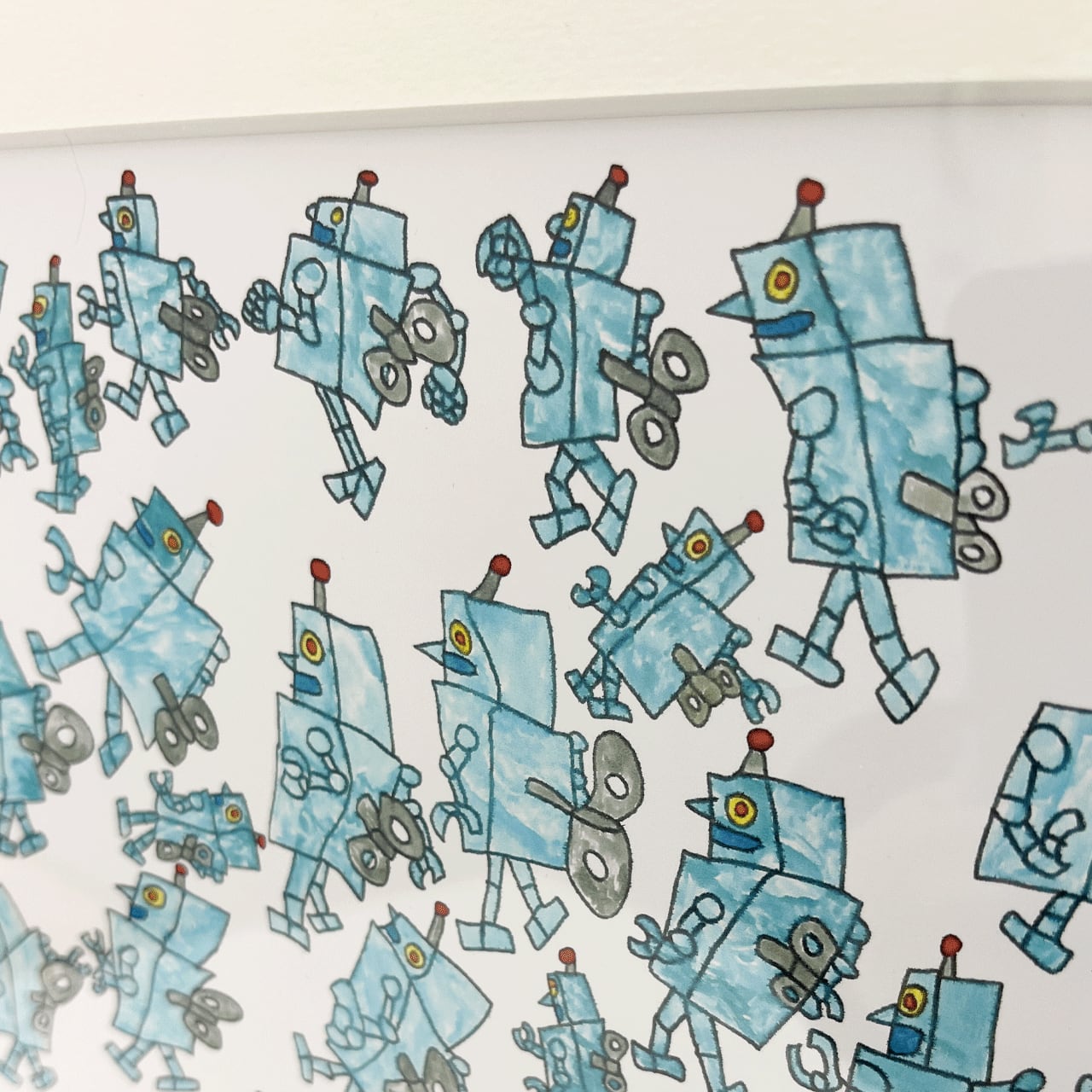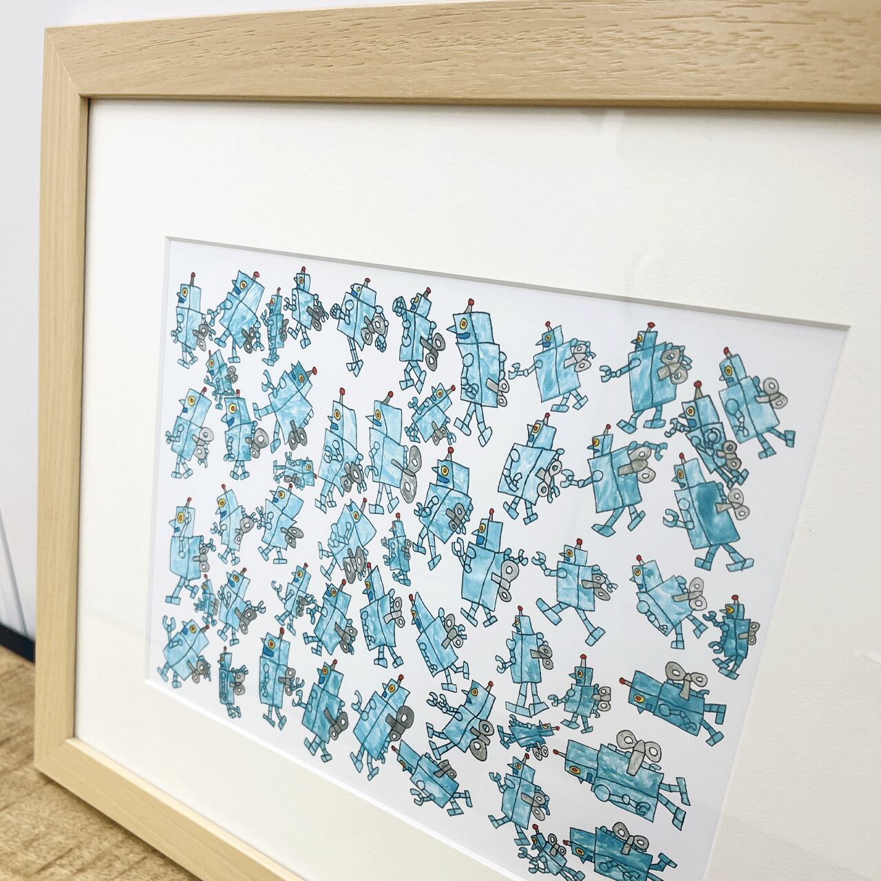 お部屋を楽しく彩る、アートパネルです。たくさんのかわいいロボットたちが描かれており、子供部屋にもぴったりのデザインです。